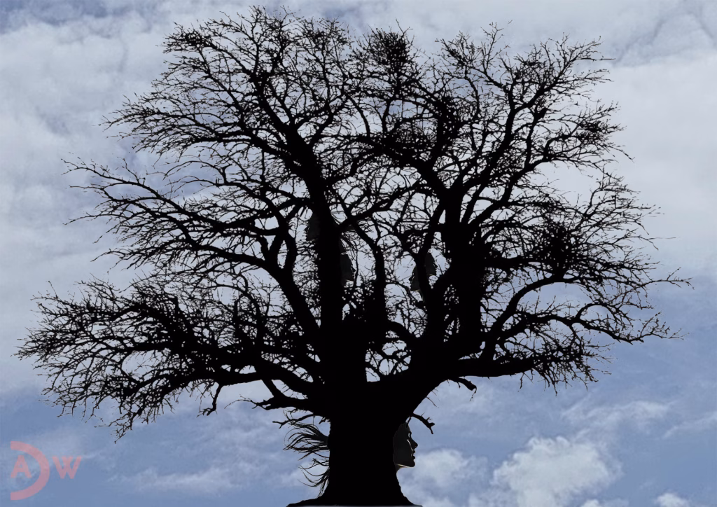 This digital work by Arslohgo, titled “L’arbre des cinq femmes” (The Tree of Five Women), presents a fascinating visual metamorphosis that oscillates between nature and human form. The piece masterfully merges a bare tree with female silhouettes, with the branches and trunk seamlessly transforming into the contours of multiple women’s profiles.