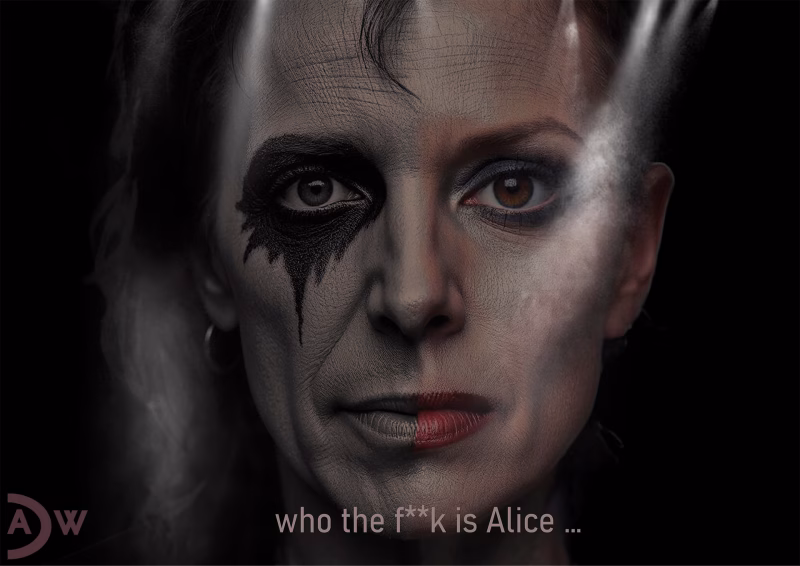 So which Alice are we talking about here? Not the saccharine subject of Smokie’s original ballad, that’s for sure. Is this aging rocker Alice Cooper experimenting with half his face in drag? Or perhaps a young woman channeling the shock rock legend on her right side? Maybe. Could it even be a grown-up, contemporary take on Alice in Wonderland? The work centers on the name “Alice” itself—a name that crosses gender lines—allowing both masculine and feminine characteristics to coexist in a single face. The evidence seems to point toward the Alice Cooper/young woman interpretation. That unmistakable eye makeup is pure Alice Cooper, and those subtle stage lights radiating in the background reinforce this reading. The phrase “who the f**k is Alice” references the raucous 1995 cover version of Smokie’s vanilla soft rock hit “Living Next Door to Alice” (1976)—a remake that transformed the original into something both funny and musically cringe-worthy. Back in my day, admitting you liked bands like Smokie was social suicide in serious music circles—and honestly, that hasn’t changed one bit.