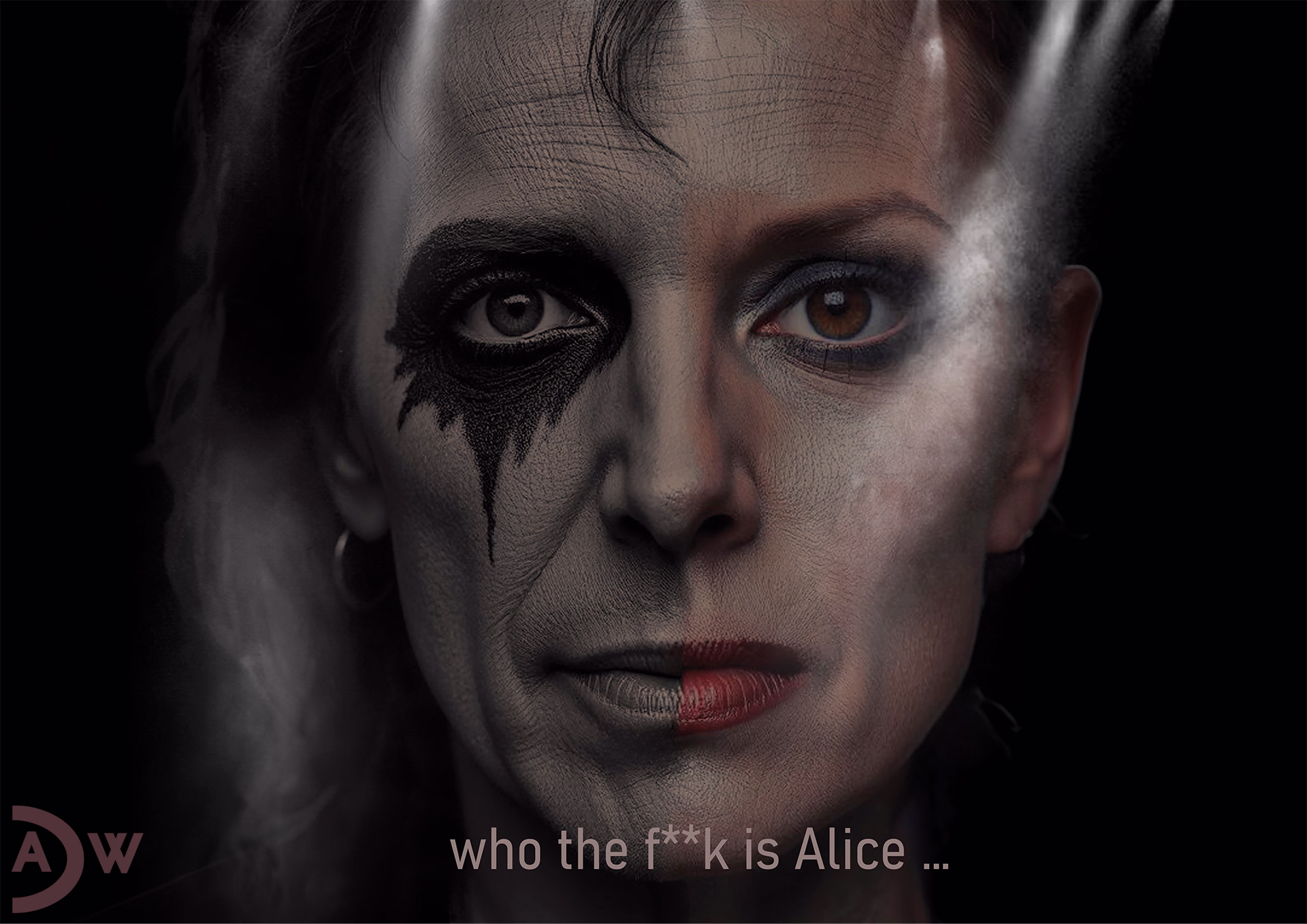 “Alice” exploits the ambiguity of names to explore the fluidity of identity, the performative nature of gender, and how names can transcend traditional gender boundaries. The image presents a face split vertically down the middle against a stark black background. The right half displays masculine features rendered in grayscale, complete with Alice Cooper’s signature black makeup streak beneath the eye. The left half reveals feminine features in natural skin tones, with lips painted a bold red. The two halves blend seamlessly together. Beneath the face appears the provocative question: “who the f**k is Alice.”