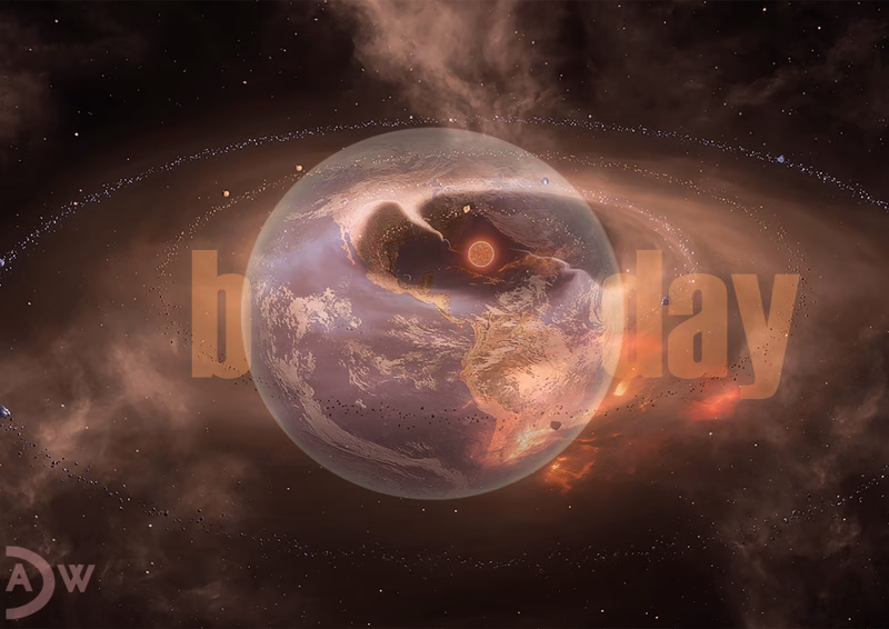 “b-earth-day”—the embedding of the earth from a space perspective in the context of a star in the process of formation generates the theme of this work. By integrating the image of the earth into the sequence of letters ‘b-d-a-y’ and placing it visually in the foreground, a future elementary event is created. A birth-day in itself is a wonderful thing/the b-earth-day (bˈɜːθde͡ɪ) here is the end.