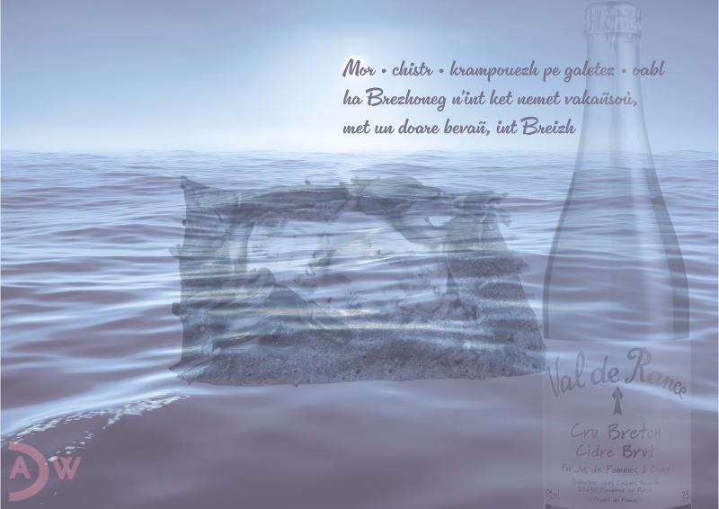 “Be Breizh”—Sea, cider, crêpes or galettes, sky, and Brezhoneg represent more than vacation elements; they embody a way of life—they are Brittany itself. This realization struck me when I returned to Brittany for the first time in over 25 years. Since Brittany remains the only place where Celtic culture survives through Brezhoneg, I composed the image’s tribute in that language.