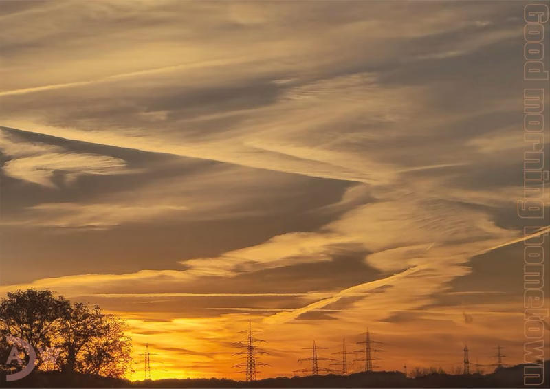 View from my kitchen window: Sky at sunrise in February, one of various variants of “Behind the Curtain.” A characteristic of these variants are the recurring electricity pylons (in varying numbers), which—like the trees, when visible—stand for life energy in a figurative sense.