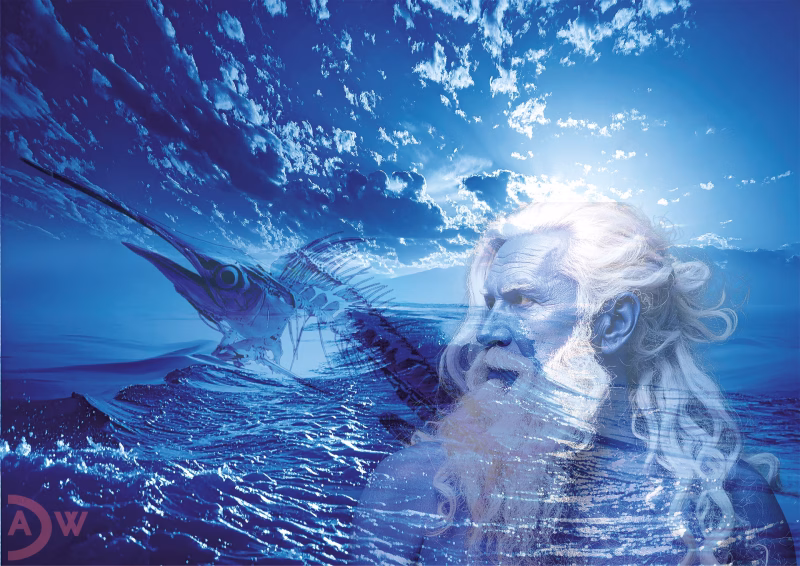 A deep blue sea blends seamlessly into an equally blue sky, with clouds drifting swiftly overhead. From the water, a marlin’s skeleton emerges behind an old, white-haired man—any well-read viewer will immediately recognize this as Hemingway’s ‘The Old Man and the Sea.’ “Marlin’s Fate” transforms Hemingway’s classic tale into a contemporary environmental allegory. By rendering everything in ocean blues and merging sea and sky, I’ve created an all-encompassing aquatic world that emphasizes how oceans dominate our planet while remaining vulnerable to human impact. The skeletal marlin takes on new meaning. In Hemingway’s original, Santiago’s epic struggle with the marlin represents nobility in both victory and defeat. Here, the skeleton becomes something more ominous—evidence of humanity’s pyrrhic victories over nature. The white-haired figure appears wise but is anything but: we possess the knowledge and capability to destroy, yet lack the wisdom to refrain. The pristine water surface is deceptive, concealing the pollution beneath: microplastics, sewage, toxic waste, and the devastation of overfishing. Together, they build a damning case that our “victories” over nature are ultimately self-defeating.