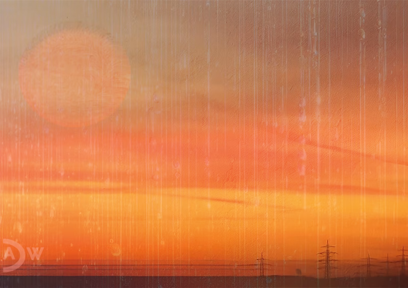 View from my kitchen window: Sky at sunrise in February, one of various variants of “Behind the Curtain.” A characteristic of these variants are the recurring electricity pylons (in varying numbers), which—like the trees, when visible—stand for life energy in a figurative sense.