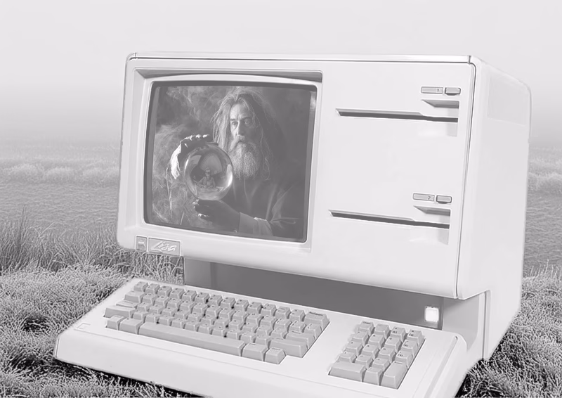 How present is the past, how past is the present? How ghostly is the modern, how modern is the mystical? A pioneering computer with a graphical user interface, set in a fog-laden polder landscape, its screen displaying a seer-sorcerer presenting Escher in his glass sphere — in an age when everything but the landscape should be a thing of the past.