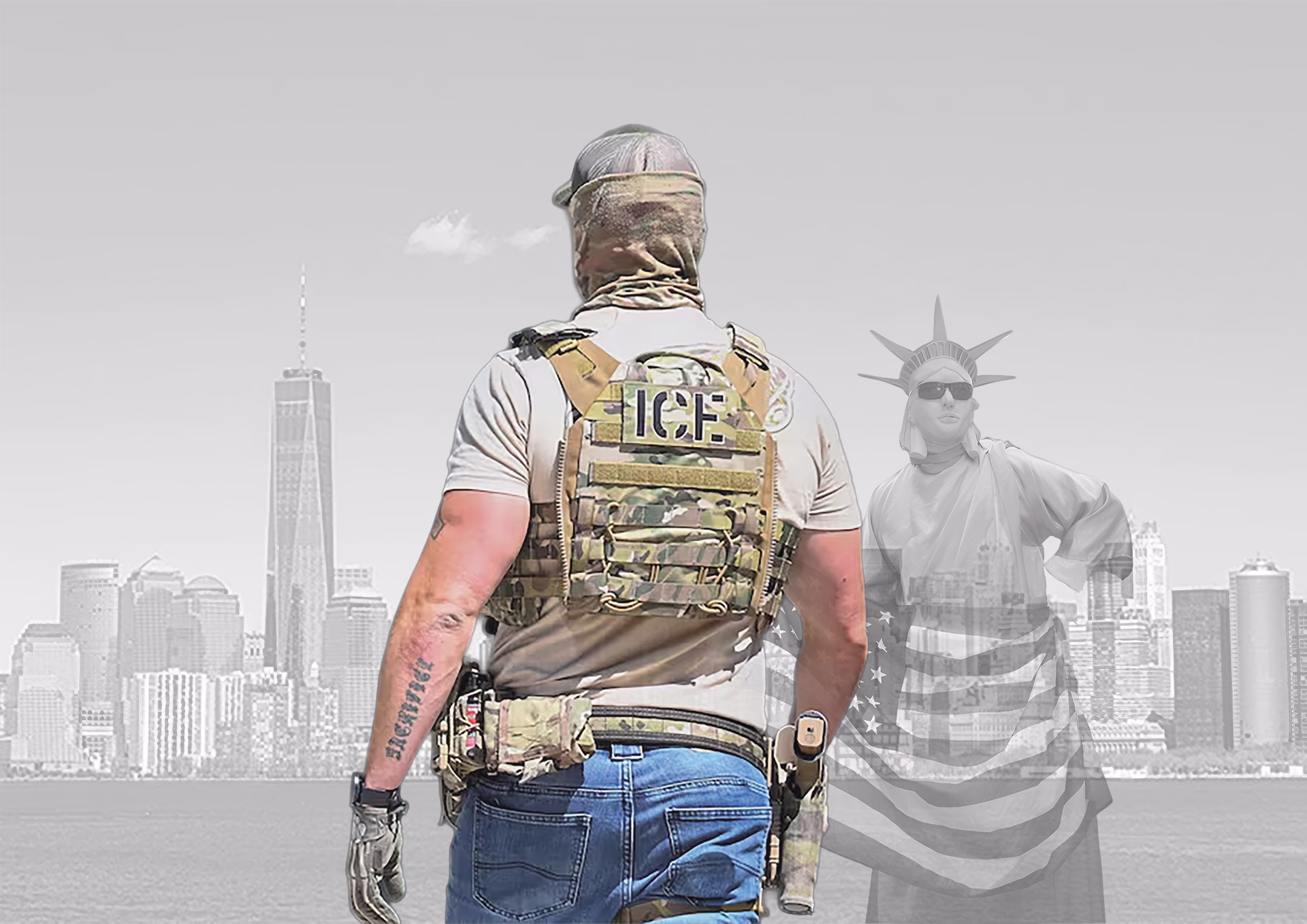 “New ICEland – Land of the Unfree” – where ICEland has nothing in common with the Scandinavian island except for the name – represents the Trumpist machinations of the American immigration authority ICE (Immigration and Customs Enforcement), which tramples democracy underfoot (with weapons and violence). ICE is waging a war against unwanted citizens. The country that only became a great nation through immigration now deals ruthlessly with people who have fallen under suspicion of being migrants. In modern America, a new class is emerging – pariahs with immigrant backgrounds. The Statue of Liberty, depicted here by a street performer, has lost its symbolic meaning and become a pale imitation of itself… “MAFA (Make America Free Again)”…