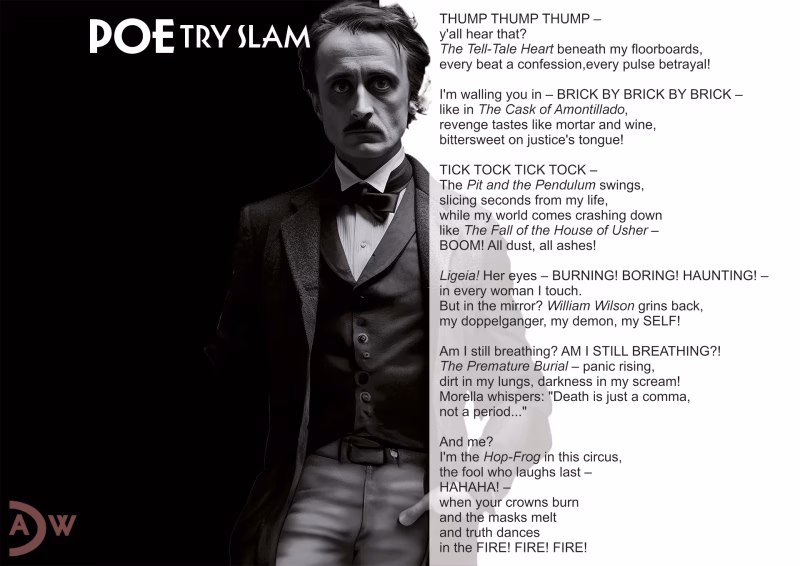 Like “POEtry A Dark Tale,” the following nine Poe stories are the starting point for “POEtry Slam”: The Tell-Tale Heart, The Cask of Amontillado, The Pit and the Pendulum, The Fall of the House of Usher, Ligeia, William Wilson, The Premature Burial, Morella, and Hop-Frog. The aim was to capture Poe’s elements in a modern style, bringing Poe into the present in the form of performative poetry. Performance elements (onomatopoeia, repetitions, dramatic emphases) are presented in capital letters, the basic titles in italics.