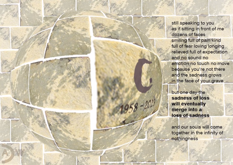 Sadness Of Loss Sadness Of Loss »Review« “Sadness of Loss” is an emotional state during a visit to C’s grave. The gravestone was taken from a grave photograph, edited and assembled to form a mural as the background for work.