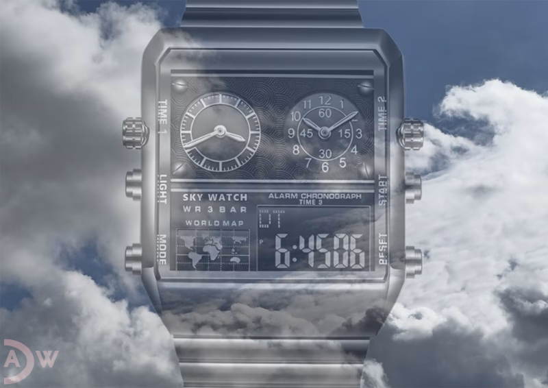 Sky view with embedded wrist-watch together denote an activity that is only indirectly related to time—observing the sky, usually for celestial objects such as stars, comets or satellites.