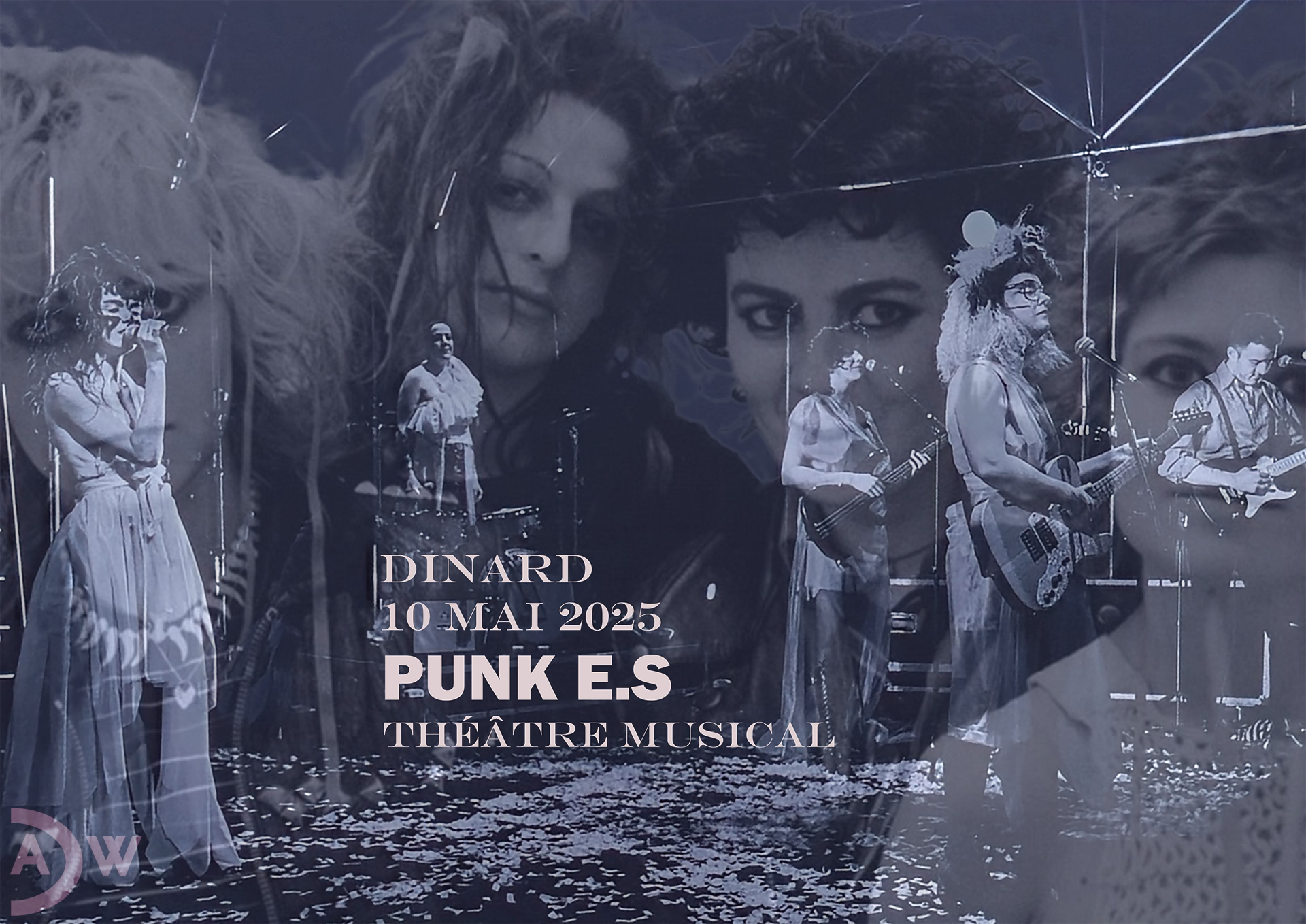 “Or How We Didn’t Become Famous”—Tribute to The Slits—This work originated from a theater poster advertising a musical about England’s first female punk band, the Slits, from the late 1970s. The band’s German founder, Ari Up, died of breast cancer at age 48. In this modified version of the poster featuring the musical’s performers, images of the Slits from the early 1980s appear to follow the performance.