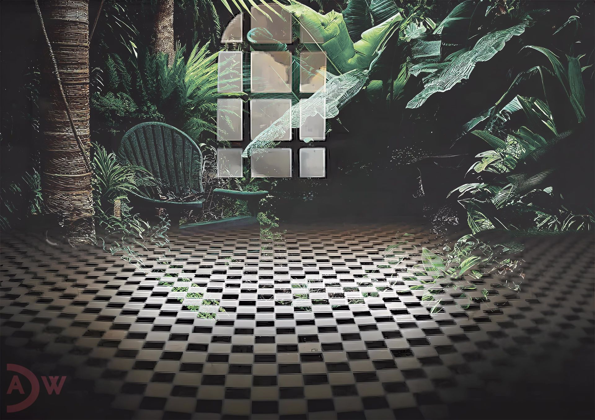 “Zero Zero–System 605 is Down” refers to the narrative of a concept album by British musician Mike Batt that was released in the early 1980s and became my favorite at that time. “Zero Zero” (the name of the album) tells the story of a dystopian future society from which all emotions have been banished, in which human feelings are to be reduced to nothing (“zero”). If feelings do arise, the people concerned are sent to an emotional decontamination facility called “Zero Zero,” a place where emotions are lobotomized so that people can once again conform to the emotionless standards. After  this music had been absent from my life for more than forty years before finding its way back into my ears, I took this as an opportunity to bring the story to a pictorial conclusion. System 605, a world that is primarily depicted (in the music videos) in small checkered black-and-white patterns, is depopulated, and nature is reclaiming what was taken from it. The work shows Zero Zero already partially covered by vegetation, and even in the black-and-white patterned floor, the first plants are breaking through.