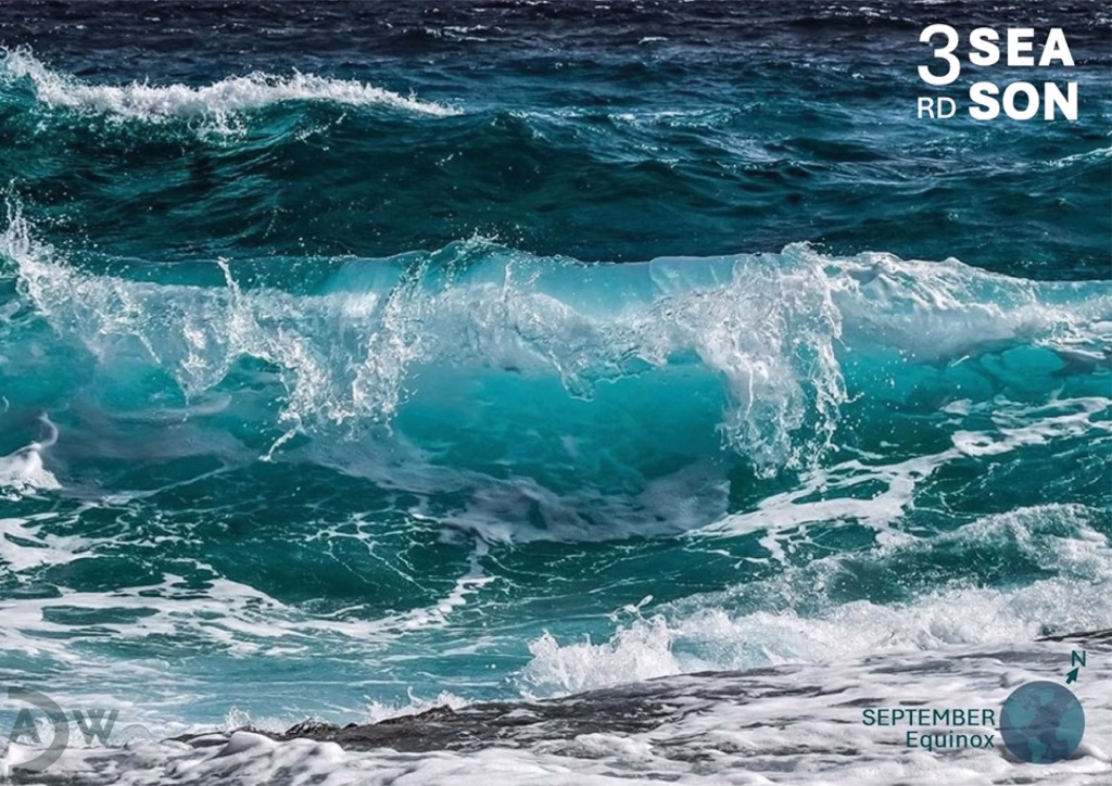 The typographic intervention “3RD SEASON” in the upper right corner establishes a temporal order that simultaneously appears threatened by its positioning—as if it could be swallowed at any moment by the advancing water masses. This precarious placement of text mirrors the fragility of human systems of order when confronted with elemental forces. The addition of “September Equinox” at the bottom anchors the work in a specific cosmological moment of balance, here paradoxically visualized through maximum imbalance.