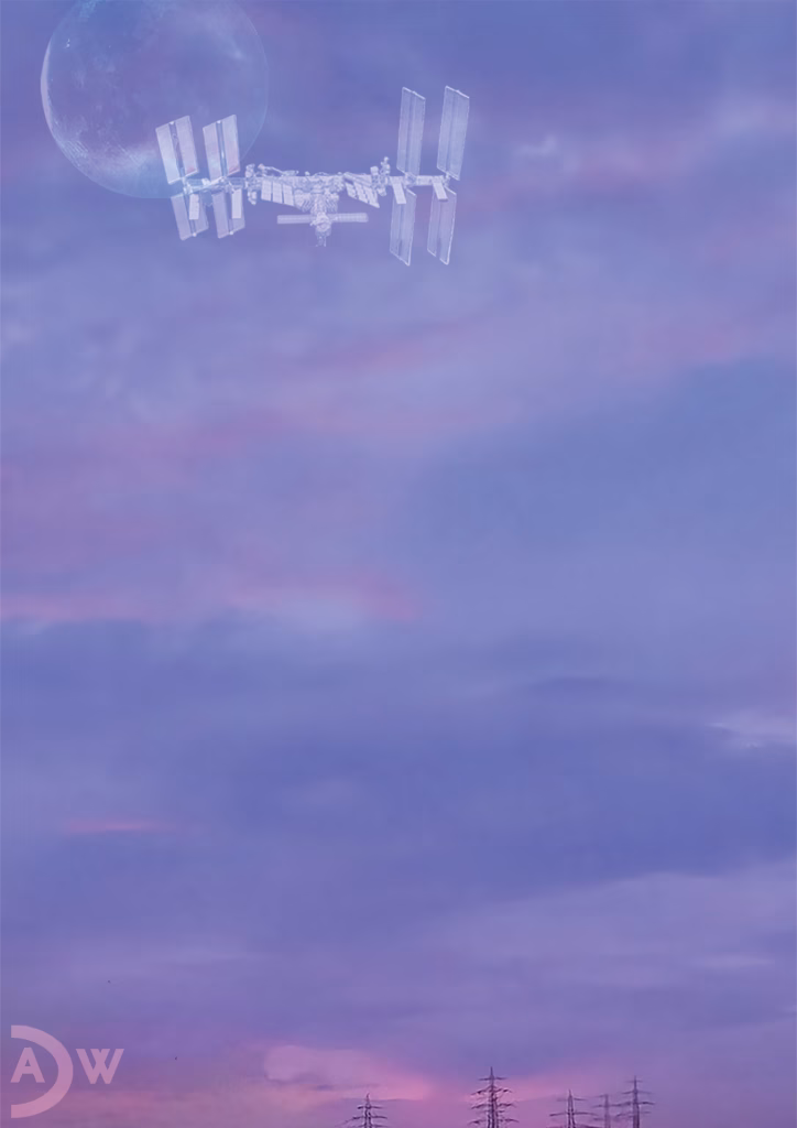 The composition operates with remarkable chromatic dramaturgy: a sky suffused with violet and magenta forms the atmospheric framework within which the International Space Station hovers as a ghostly, translucent apparition. This color palette evokes not only the phenomenon of the Aurora Borealis but also those liminal moments between day and night, between reality and dream. The ISS appears less as a triumphant symbol of human engineering than as a fragile exoskeleton of human presence in the vacuum—transparent, almost ethereal, as if it could dissolve into the cosmic void at any moment.