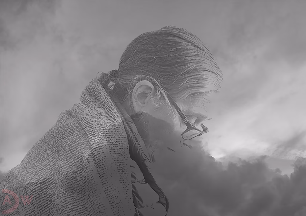 The radical decision to render the image in monochrome transforms the personal into something universal. The grayscale doesn’t function as aesthetic reduction but as semantic compression—stripping away the distractions of the particular to elevate the image to a plane of existential universality. The subject’s profile, carved out with sculptural precision, recalls the tradition of memento mori imagery without adopting its didactic weight.