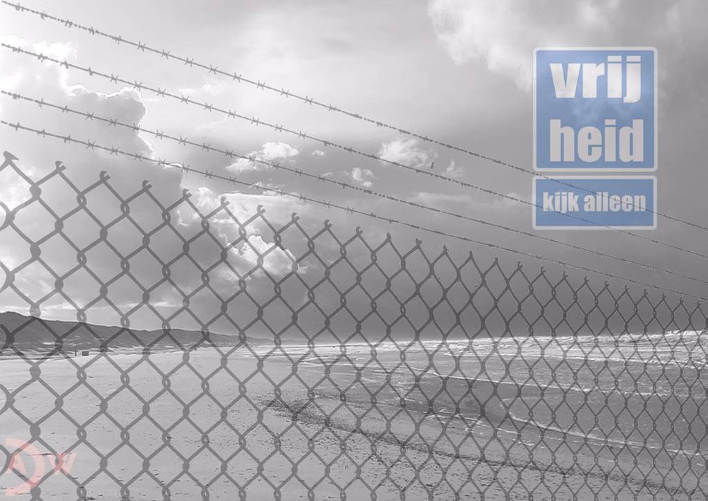 The bilingual text intervention “vrij heid” / “kijk alleen” functions as a conceptual turning point. “Vrijheid” (freedom) appears deliberately split as “vrij heid,” which in Dutch can suggest both “freedom” and “free heath”—a wordplay that underscores the multifaceted nature of the concept of freedom. “Kijk alleen” (just look) below reads like a resigned instruction, a directive for passive observation rather than active participation.