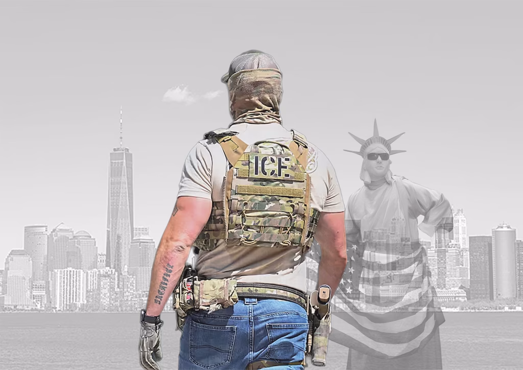 The positioning of the figures follows a deliberate hierarchy of power. The ICE agent stands central, massive, impossible to overlook—he literally blocks the view of the city behind him. The Statue of Liberty, by contrast, is pushed to the margin, smaller, paler, marginalized. This spatial arrangement mirrors political reality: the ideals of American democracy are literally pushed to the sidelines while the security apparatus occupies the center.