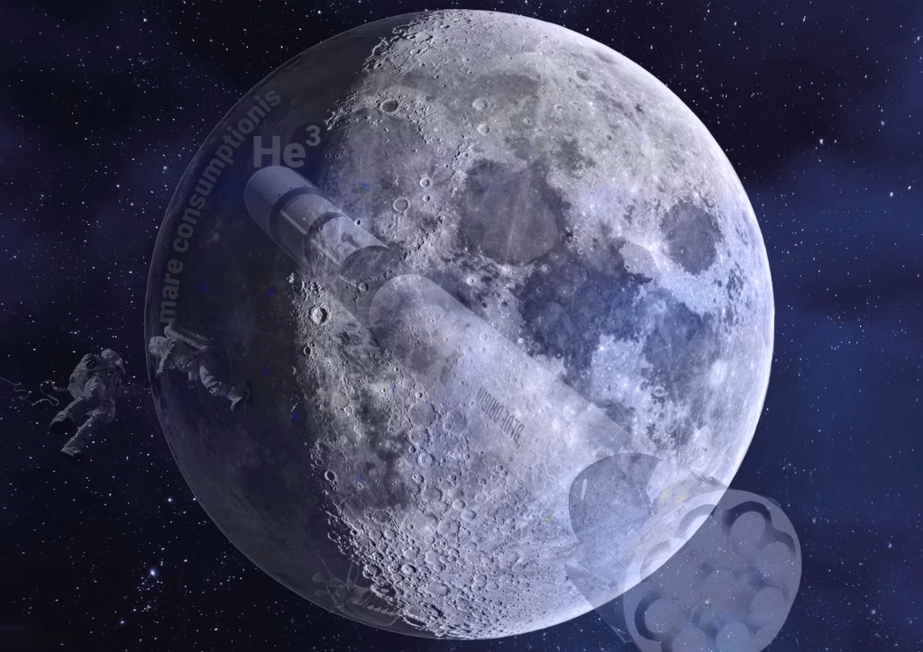 The chemical symbol “He³”—helium-3—hovers in the image like a formula of desire. This isotope, believed to exist in the lunar regolith and considered a potential fuel for future fusion reactors, becomes the cipher for a new gold rush mentality.