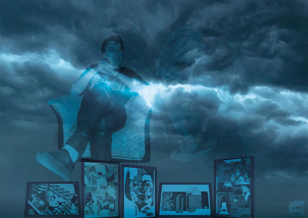 The composition itself follows a vertical logic: at the bottom, the works (what was created); in the middle, the young artist (the one who created); above, the present-day Arslohgo and the clouds (the transcended). It is an ascending movement, yet one that feels not triumphalist but elegiac—borne by the recognition that every rebirth presupposes a death.