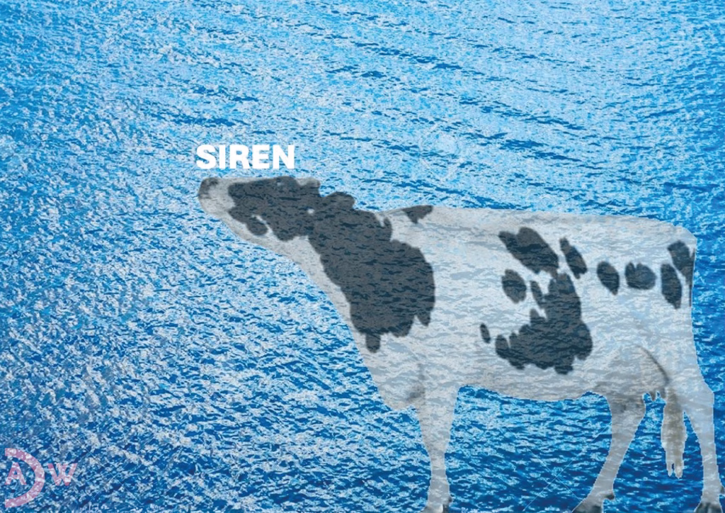 The white typography “SIREN” hovers above the cow like a label that simultaneously names and estranges. Where classical mythology depicts the siren as a seductive, dangerous creature—half woman, half bird or fish—Arslohgo presents a prosaic dairy cow. This ironic substitution exposes the mechanism of mythological projection: the siren as a phantasm of male seafaring imagination is replaced by the banal reality of a cow, which nonetheless develops its own uncanny poetry in the oceanic context.