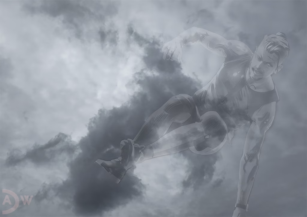 The composition presents a figure in dynamic motion, enveloped in cloud-like formations that can be read simultaneously as atmospheric disturbance and digital dissolution. This visual ambiguity recalls Paul Virilio’s concept of “dromology”—the study of speed as the defining factor of modern existence. The Skystriker doesn’t simply vanish into the sky; he’s absorbed by it, transforming into pure kinetic energy.