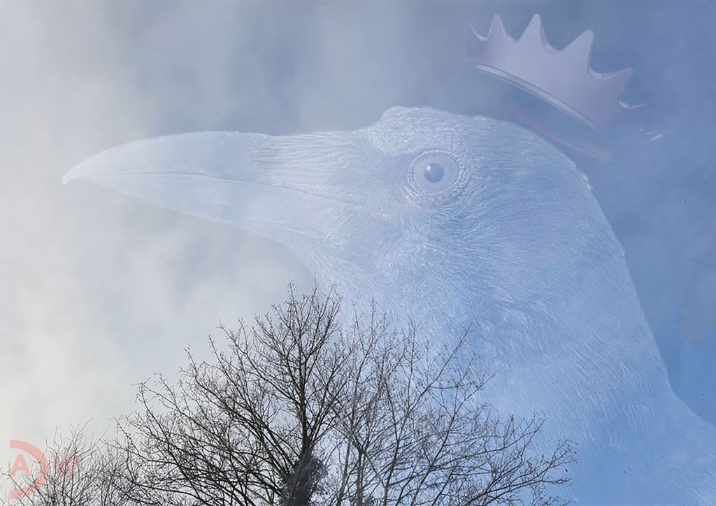 Simultaneously, the apparition’s spectral quality evokes the fragility of such power. Like a ghost from the past or projection from the future, the crowned crow hovers over its bare domain—a sovereign over a realm of transience.